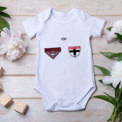 The left half proudly displays the colors and emblem of one AFL team, capturing the essence of the game loved by many. On the right half, another team’s details create a harmonious yet playful contrast, symbolizing the unity that sports can bring. Crafted with care and a touch of team pride, this baby one piece is a perfect blend of sports passion and infant charm.