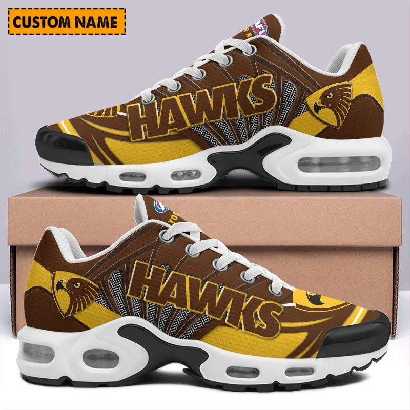 These shoes feature clear Hawthorn Hawks graphics and are designed for both men and women.