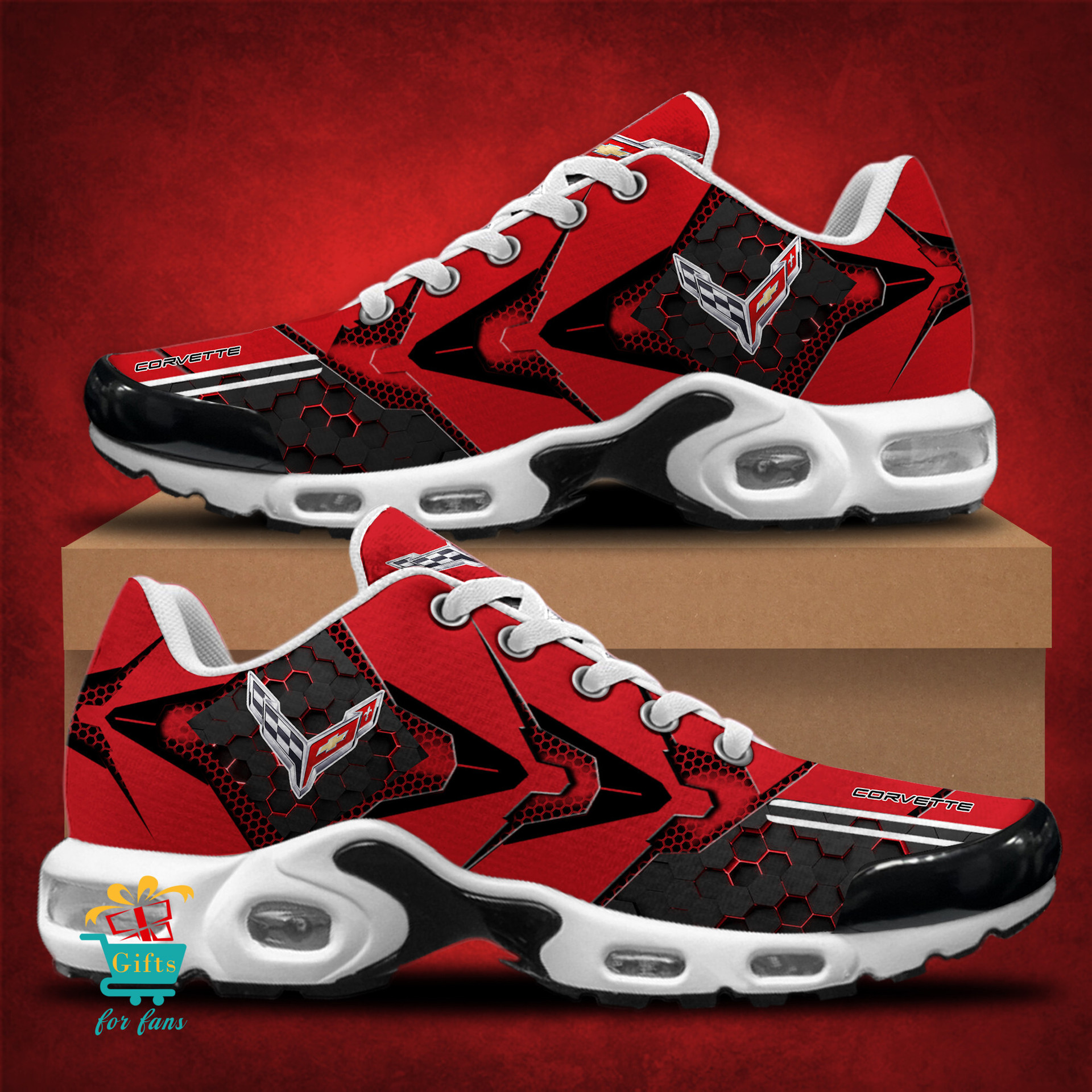 These shoes feature clear Chevrolet Corvette graphics and are designed for both men and women.