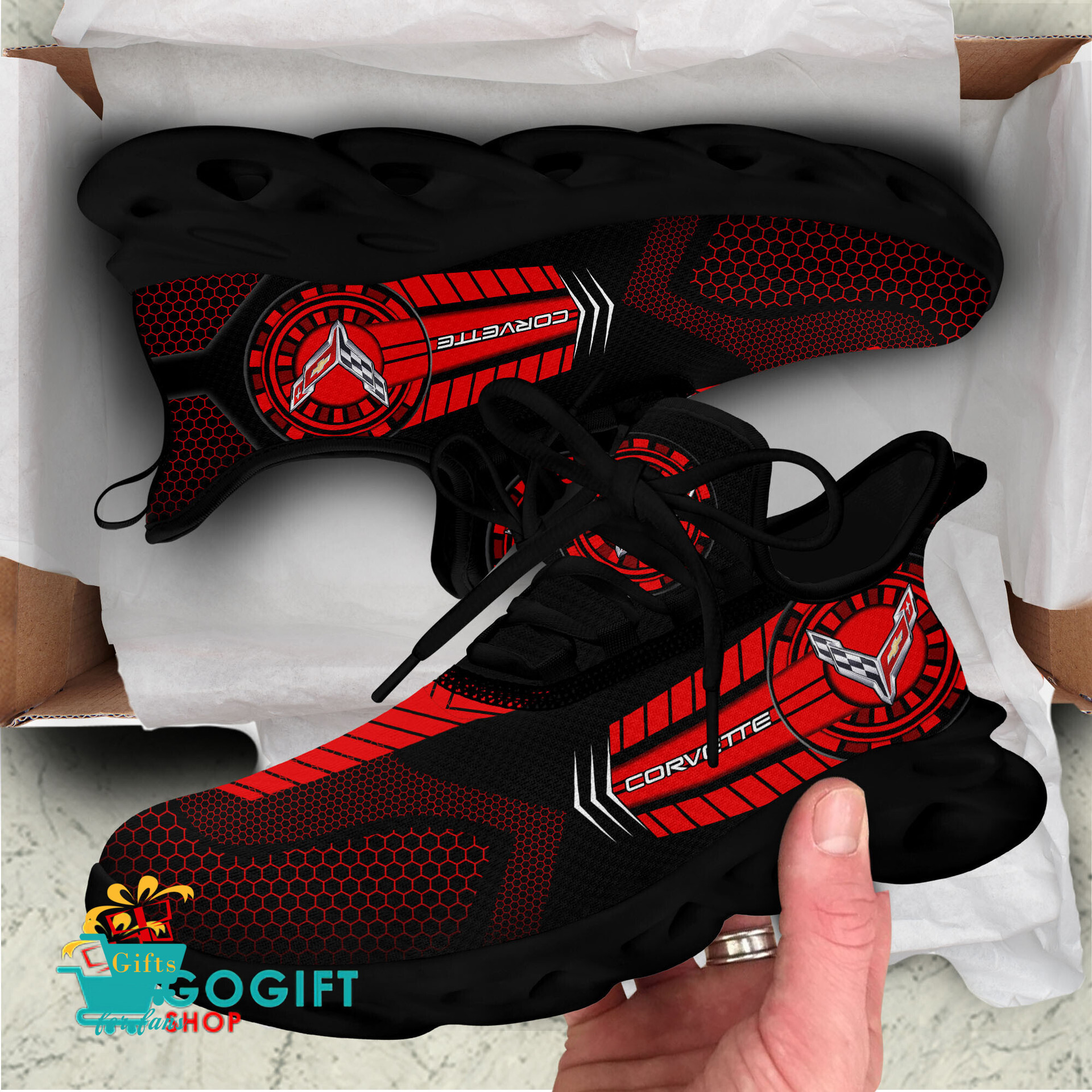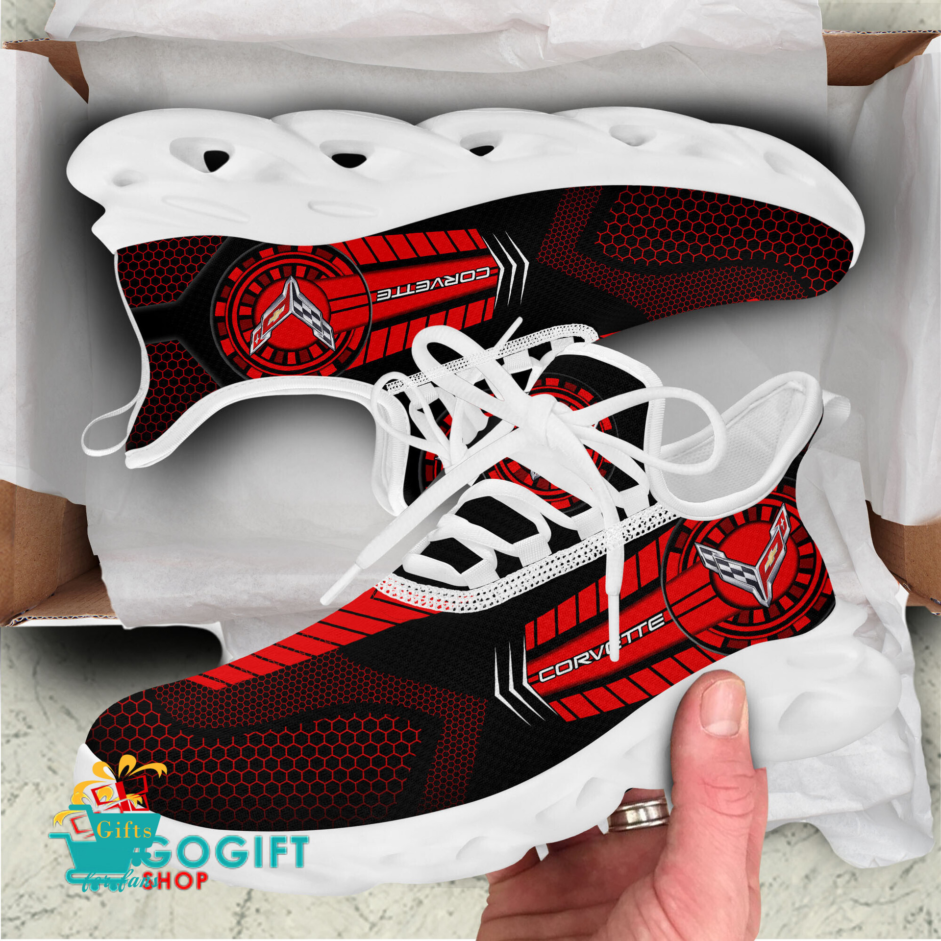 These shoes features crisp Chevrolet Corvette graphics, designed for both men and women.