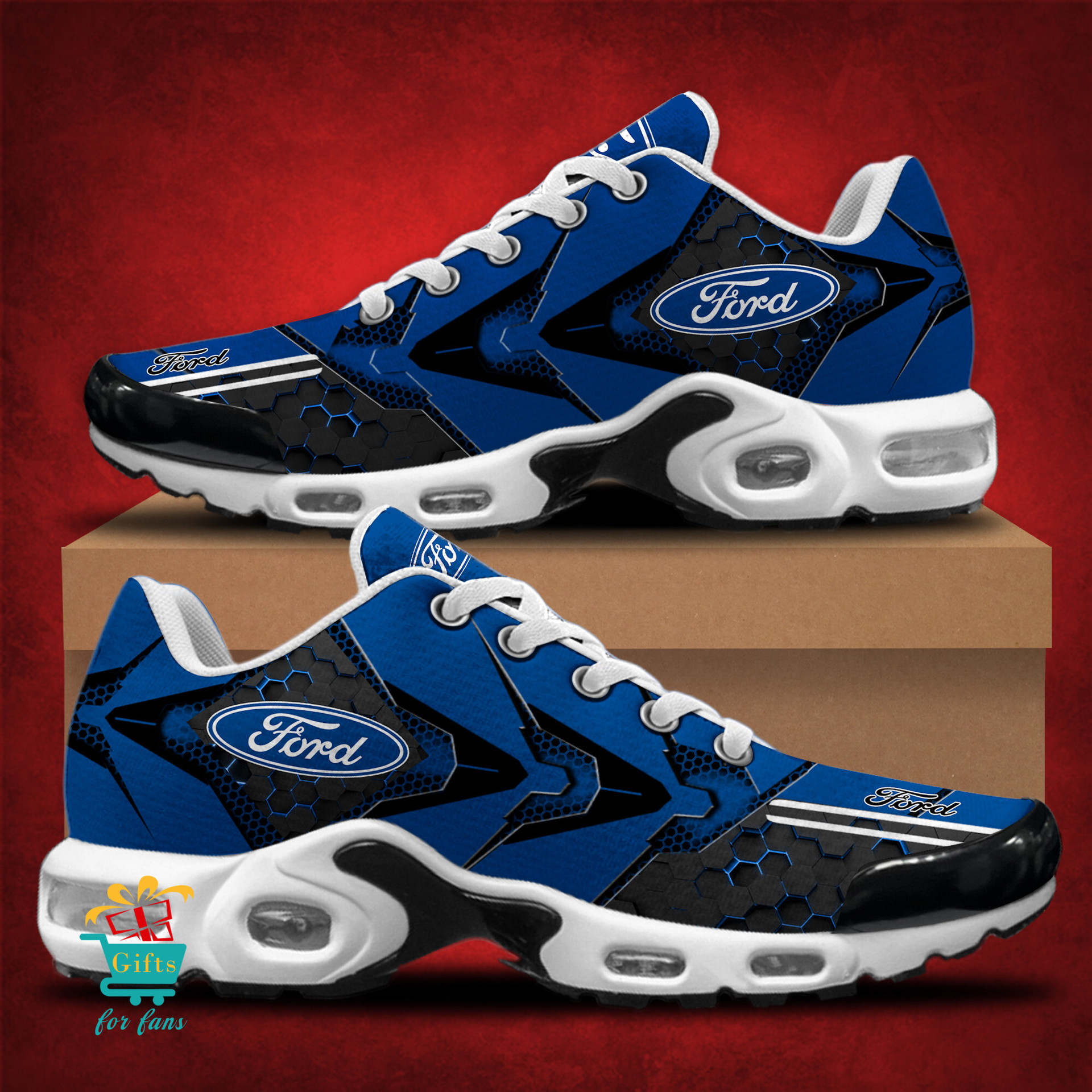 These shoes feature clear Ford graphics and are designed for both men and women.