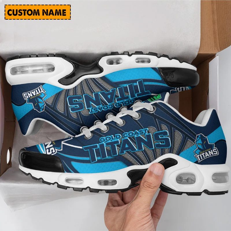 These shoes feature clear Gold Coast Titans graphics and are designed for both men and women.