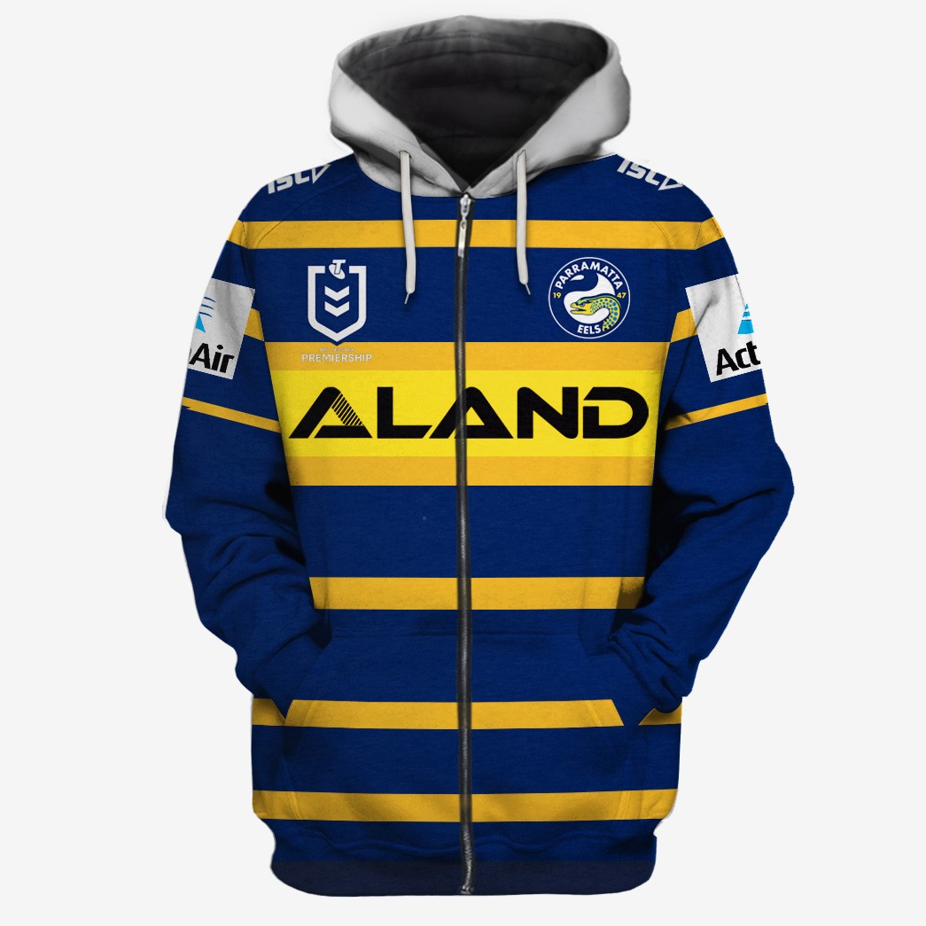 This Zip Up Hoodie features the Parramatta Eels Jersey color scheme and graphics across the chest for an eye-catching showcase of your pride. Designed for men, women, and kids.